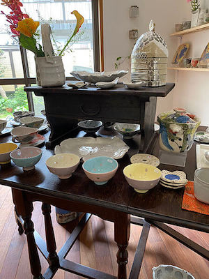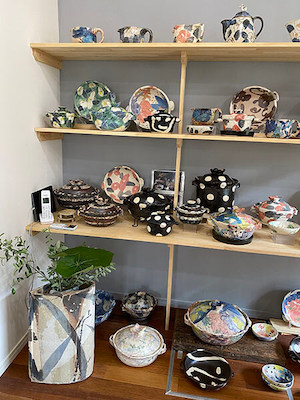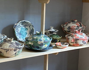 ギャラリーに入ると色鮮やかなうつわが出迎えてくれました。土鍋は力強く、見ているだけでも元気が出てきます。土鍋の蓋には表も内側にも彩色が施されていて、食卓の真ん中に「どん」と置けば、食事も楽しく華やかになりそうです。プラチナを使ったと言ううつわは少し黄みがかりな風合いとなっていて深みを感じます。私が最も圧倒されたののは作品数の多さで、ギャラリーいっぱいを飾りなお、引き出しの中までぎっしり入っていて作陶へのエネルギーを感じることができました。