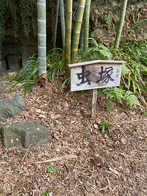 また建長寺の鎮守「半僧坊大権現」*これが地蔵であるとの説明ですが黄金色に塗色されていて、これは仏像では?と不思議でした。余談ながら「半僧坊」へに道のりは唐門から15分程度と説明がありますが、階段!急な階段!高いところが苦手なワタシは「半僧坊」を見たいというエネルギーに支えられながら登ったのでした。途中で現れる鴉天狗(明治時代頃作成)はかっこよくて見惚れてしまいそうですがうっかり足を踏み外したら💦と落ち着いて鑑賞できませんでした。下に降りる際に出会ったのは昨今(建築家の隈研吾などによって)作られたという虫塚がありました。