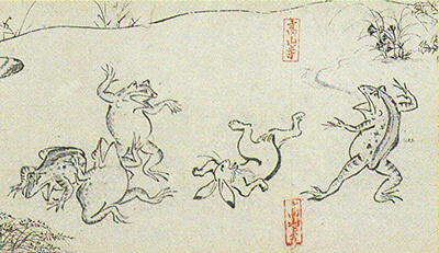 表現)「鳥獣戯画」は甲、乙、丙、丁の4巻がある。登場する猿は権力の象徴として、蛙とウサギは庶民を表していると言われる。動物を擬人化した法会画(甲巻)、動物・人がモチーフの田楽画(甲・乙巻)動物の擬人化、人がモチーフの験競べ画(丙・丁巻)をダイナミックな墨線でデフォルメして表現。作者は、鳥羽僧正覚猷(1053~1140)と言われているが、宮廷絵師説・絵仏師説・複数の制作者説など諸説ある。その中で寺院(京都の高山寺)に所蔵されていた事から、作者は絵仏師だとする説が有力視されているようだ。
