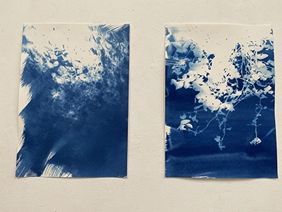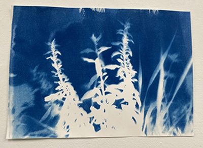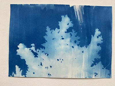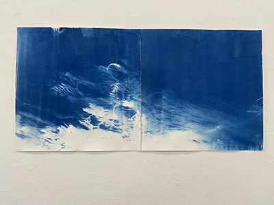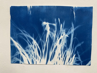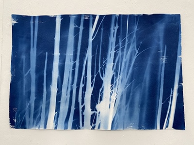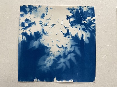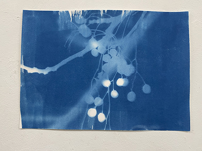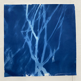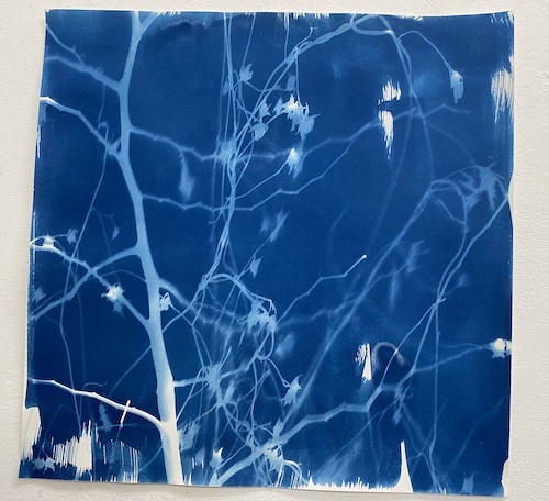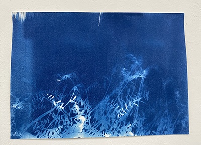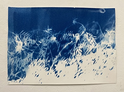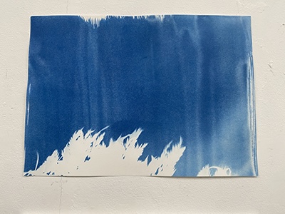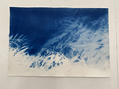 「紙に塗った感光液のムラです」という、所々白く抜けている箇所が良い効果を出しているこの作品は、日中お日様の下で作成されたはずですが、夏の夜に妖精が遊んでいるかのようなファンタジー感が漂います。聞いたところ、狙ったわけではないとのことですが、そういうナチュラルな表現がワタシはとても好きなのです。
