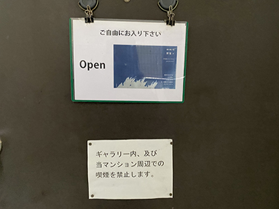 5回目となった個展開催のギャラリーヨクトは、賑やかな新宿通りの1本裏手、さらに1本奥へと入り込んだ、マンションの1Fにあります。ビルの内側にあり少し分かりにくい場所ですが今回は外にポスターが置かれていたので(逆光で見にくいのですが下の写真左)、ビル前に行けば通り過ぎてしまうことはなさそうです。