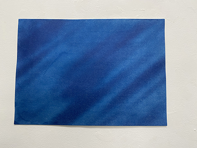 写真は瞬間を紙に焼き付けるツール、動画は時間をメディアに焼き付けるツールですが、古典的な焼き付けツールであるサイアノタイプは紙に時間をも焼き付ける不思議なツールです。>>カメラを用いずにフォトグラムの技法により写し取った画像には画像には青にグラデーションで光の痕跡が残ります。>>と、横山氏の文面にあるように光の移動(時間)がグラデーションで1枚の紙に焼き付けられるのです。画面を見ていると水の中を漂うような気分になります。