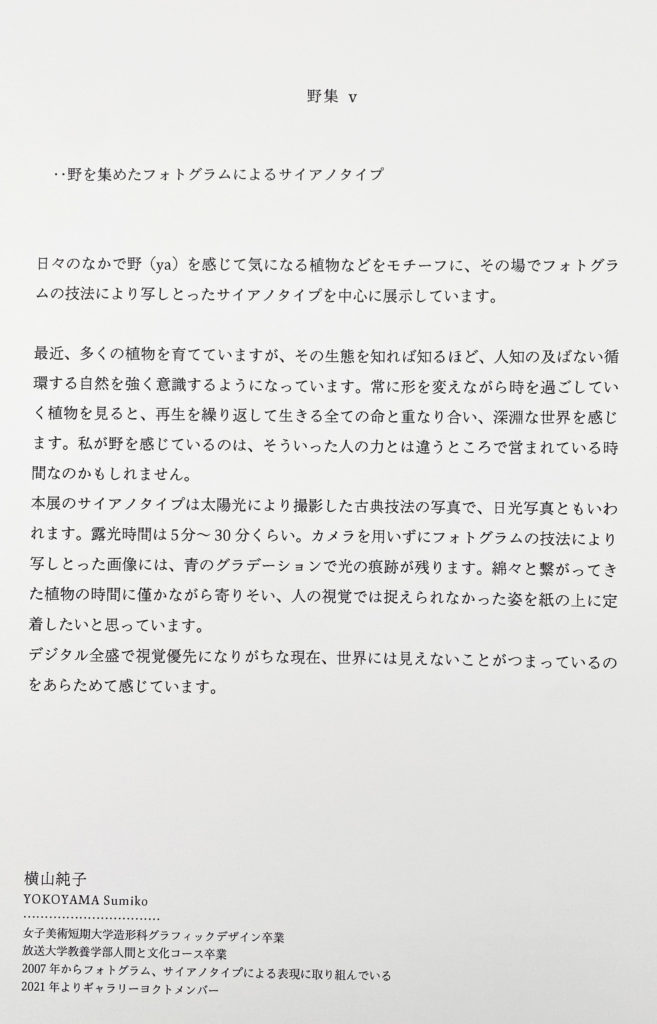 個展|..野を集めたフォトグラム&サイアノタイプ 横山純子展「野集 ⅴ」のご紹介は以上です。